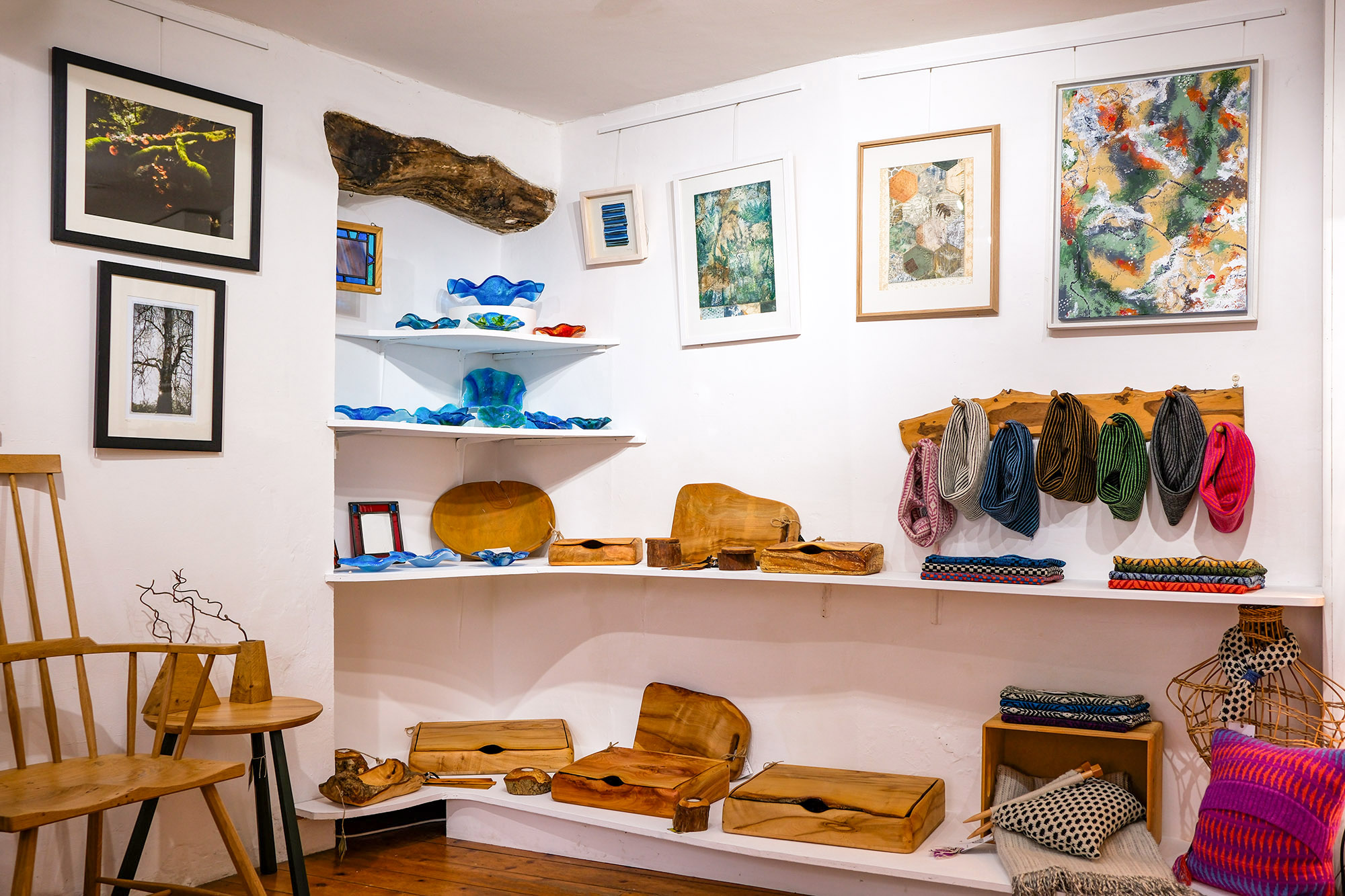 There are paintings, printing, pottery and photography; beaded, silver and glass jewellery; textile art and handmade hats, handwoven woollens; handcrafted wooden boxes, boards and furniture; glassware and more.